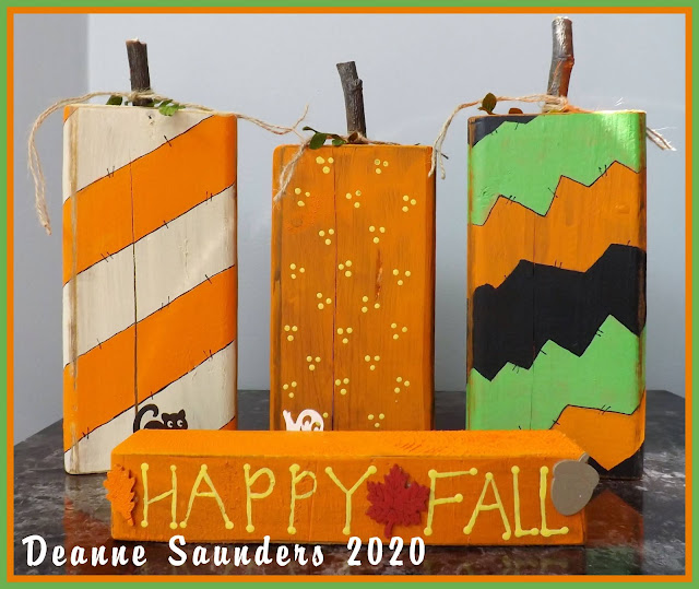 Here's what I created. It's a wooden project designed for two occasions. One side is painted for Fall. When Halloween gets closer, all I have to do is flip it to the opposite side and it's painted with Halloween characters.